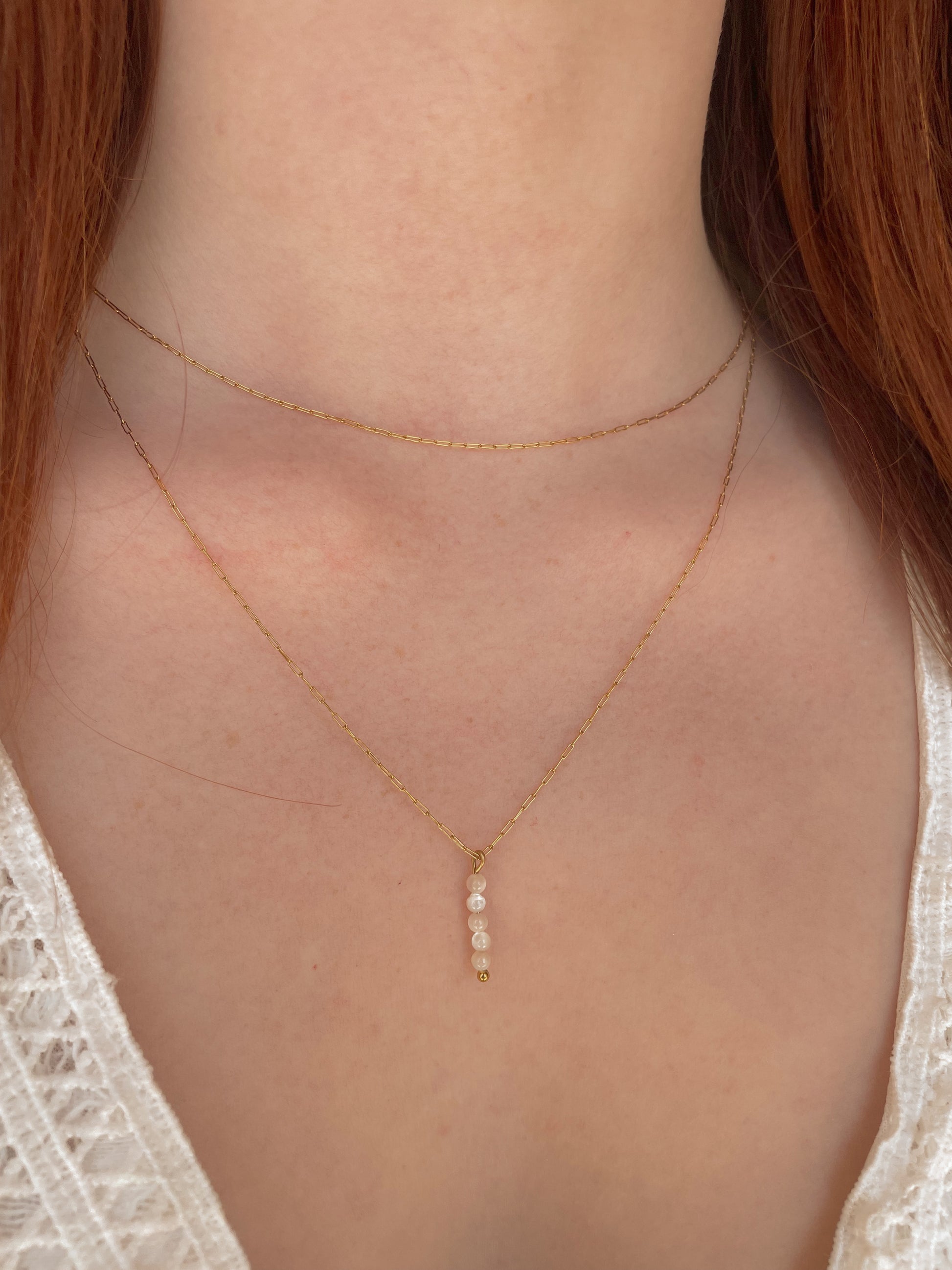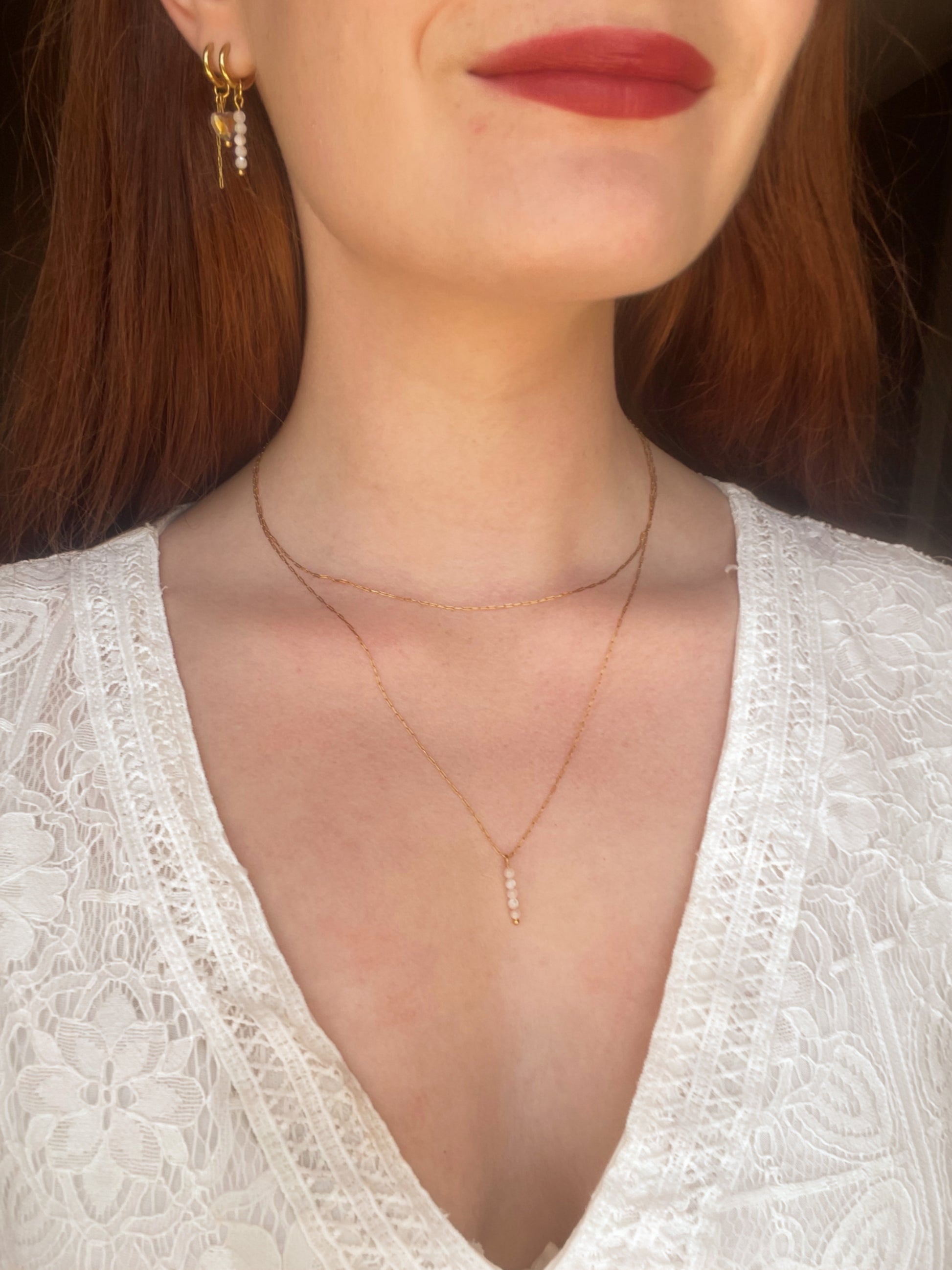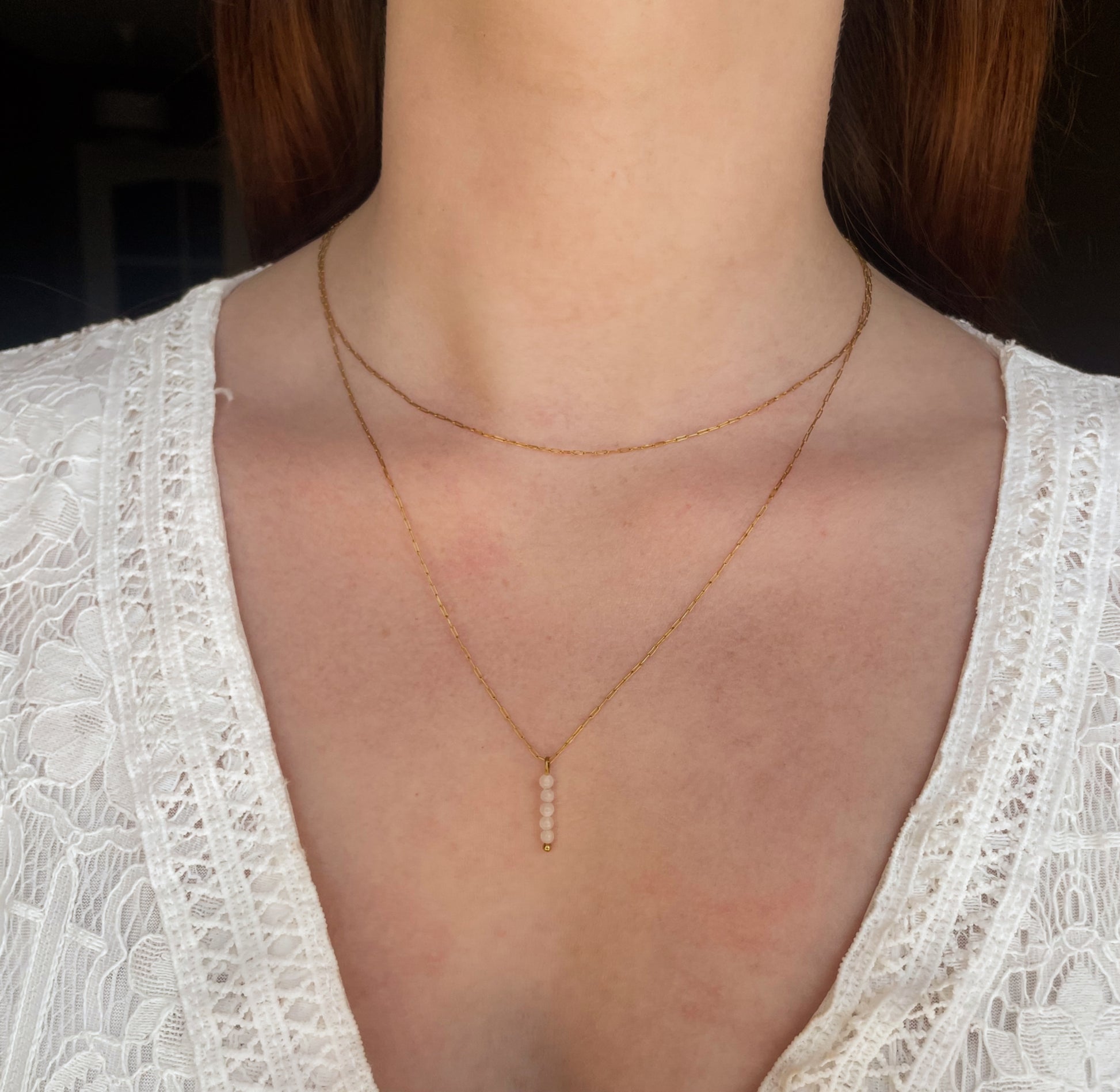 Description : Ce collier doré tout en finesse est composé de deux chaînes élégantes : l’une ras-du-cou, l’autre plus longue, ornée d’un pendentif fait avec des perles de nacre blanche. Léger et raffiné, il habille le cou et ajoute une touche lumineuse et féminine à toutes vos tenues ✨🤍