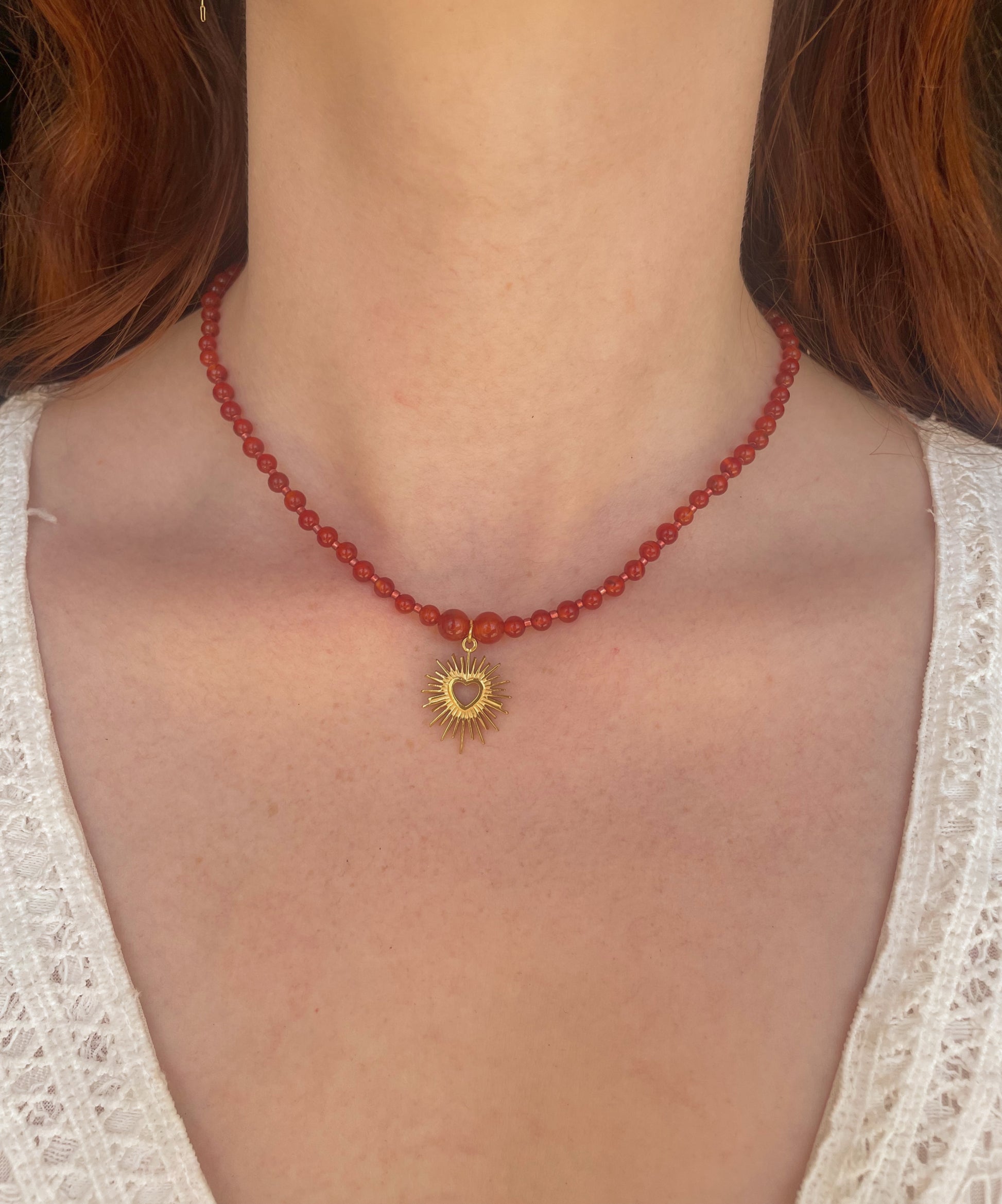 Description : Ce collier fin aux tons orangés est composé de petites perles en cornaline. Au centre, un pendentif cœur entouré de rayons apporte une touche solaire et symbolique. Léger et chaleureux, il se porte seul ou en accumulation pour illuminer toutes tes tenues avec douceur et énergie ☀️🧡