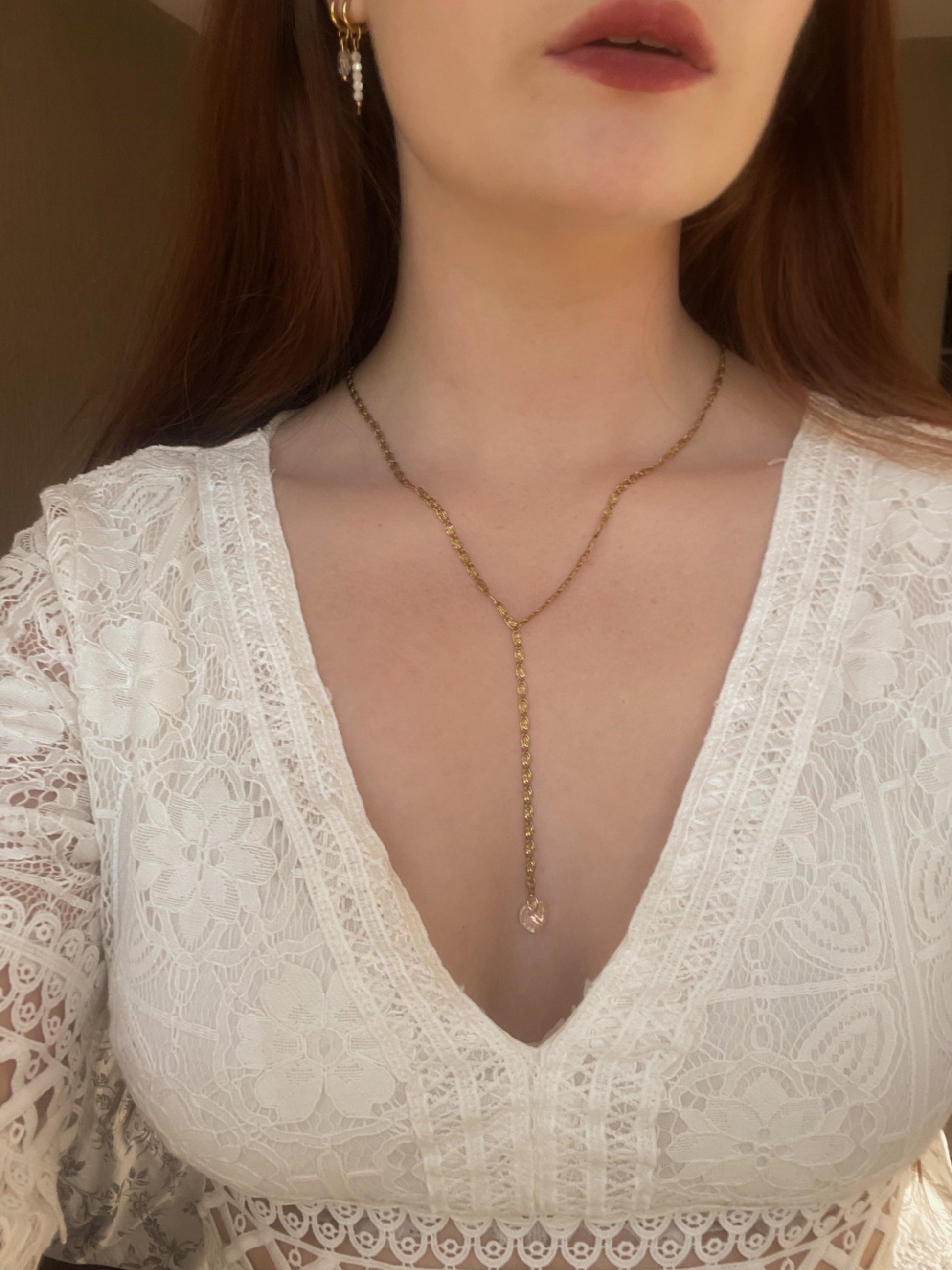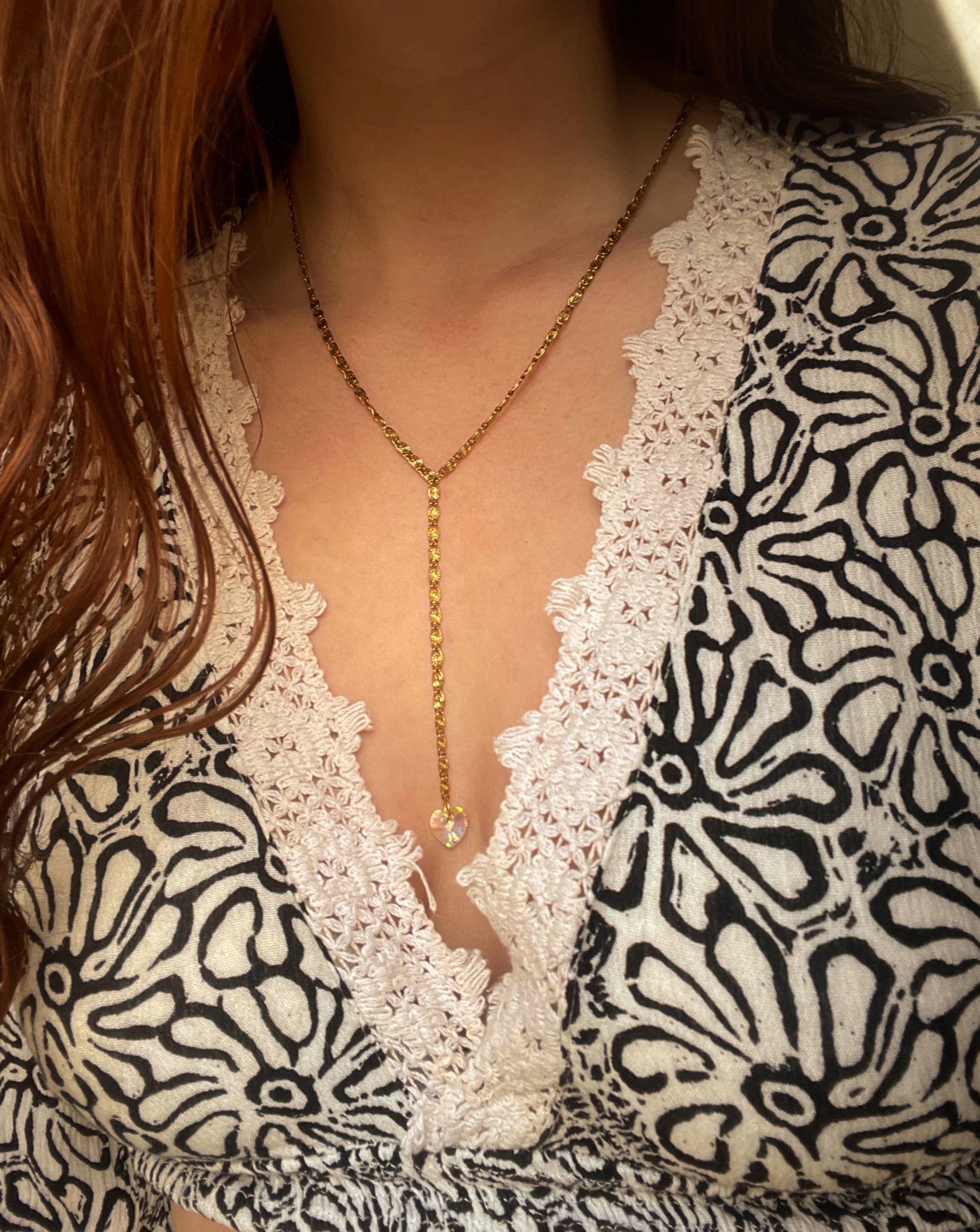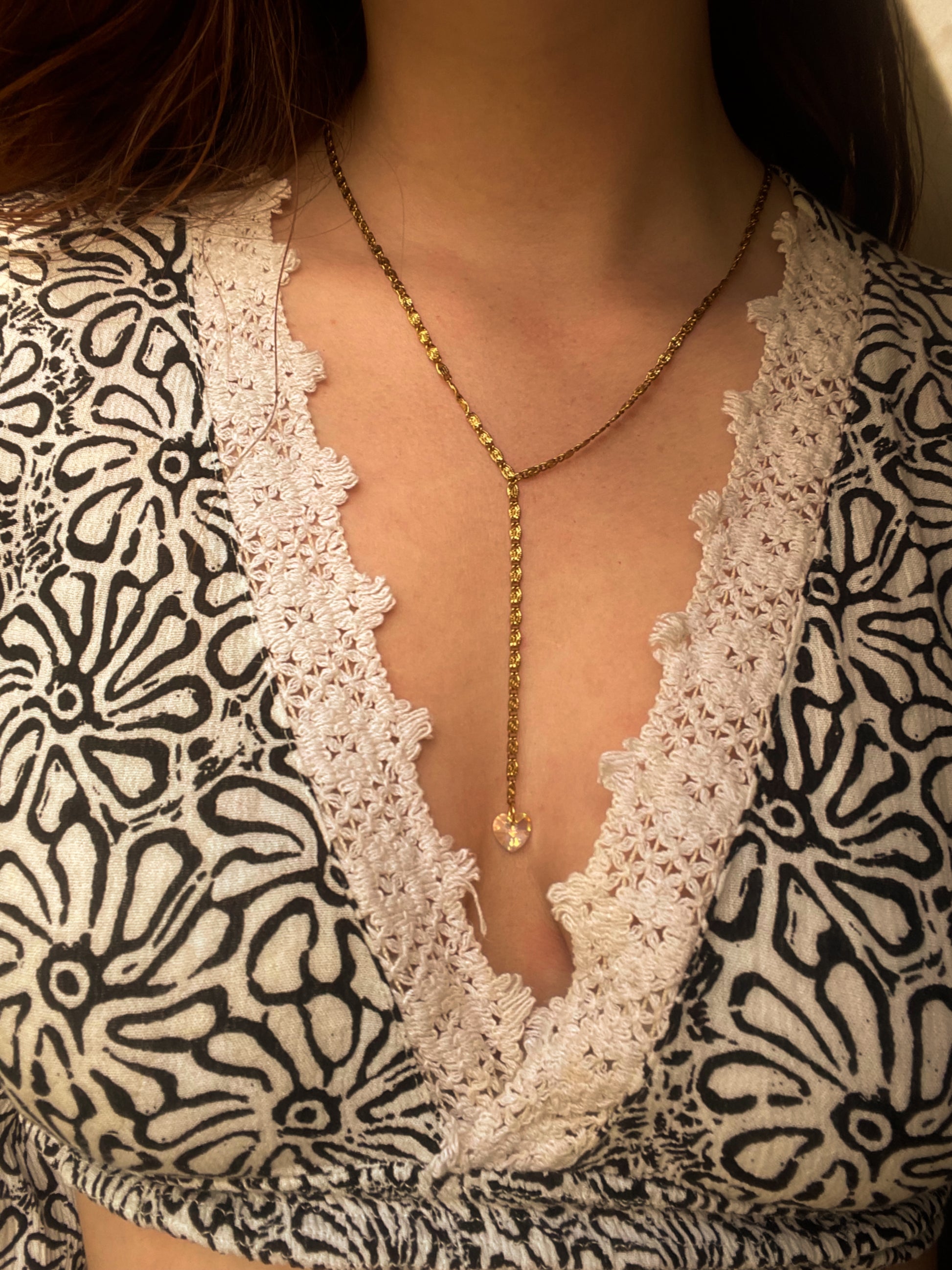 Description : Sublimez votre décolleté avec ce collier cravate. Une chaîne escargot qui descend jusqu’au creux de la poitrine, avec au bout un un pendentif en forme de cœur qui capte et renvoie la lumière. Simple, audacieux et captivant. ✨