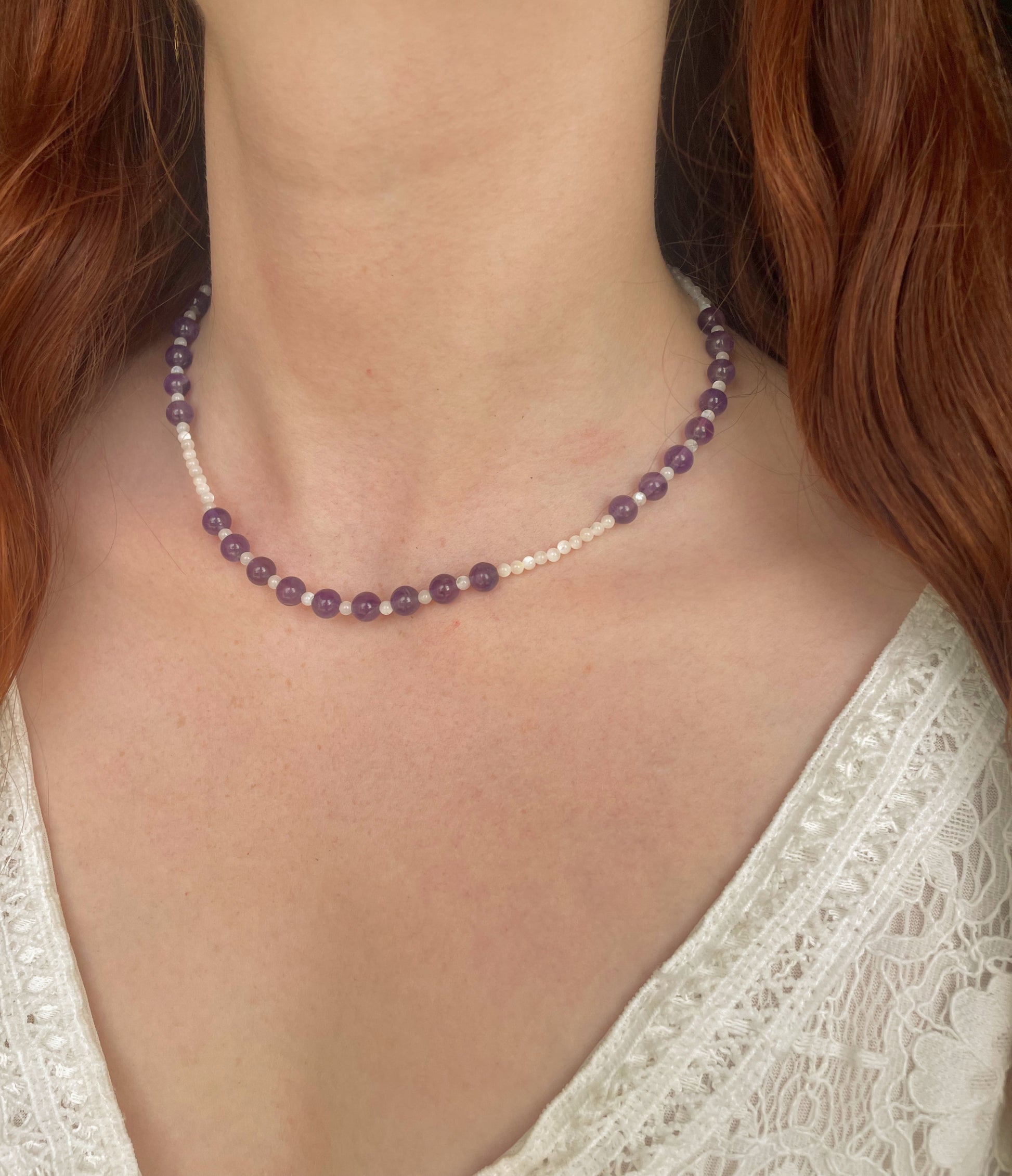 Description : Ce ras de cou allie la profondeur mystérieuse de l’améthyste violette à la douceur lumineuse de la nacre blanche. Un contraste subtil et raffiné qui évoque à la fois élégance et sérénité. Il se porte aussi bien au quotidien que lors de moments spéciaux 💜🤍