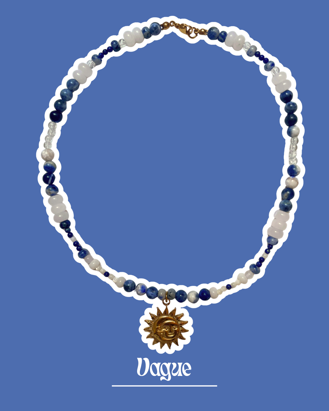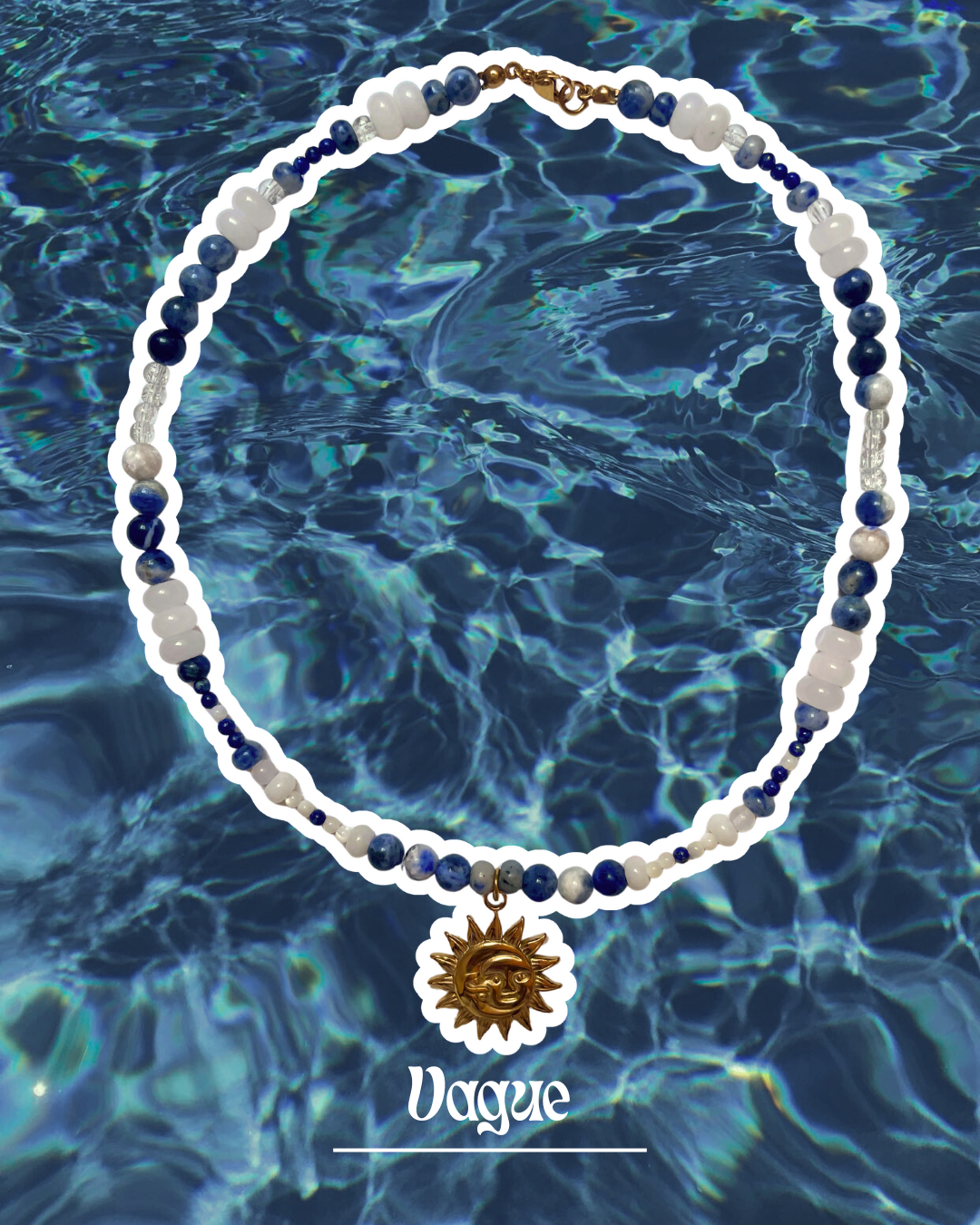 Description : Un mélange harmonieux de perles blanches nacrées et de perles dans les tons bleu clair, bleu profond, comme une vague en mouvement 🌊🤍