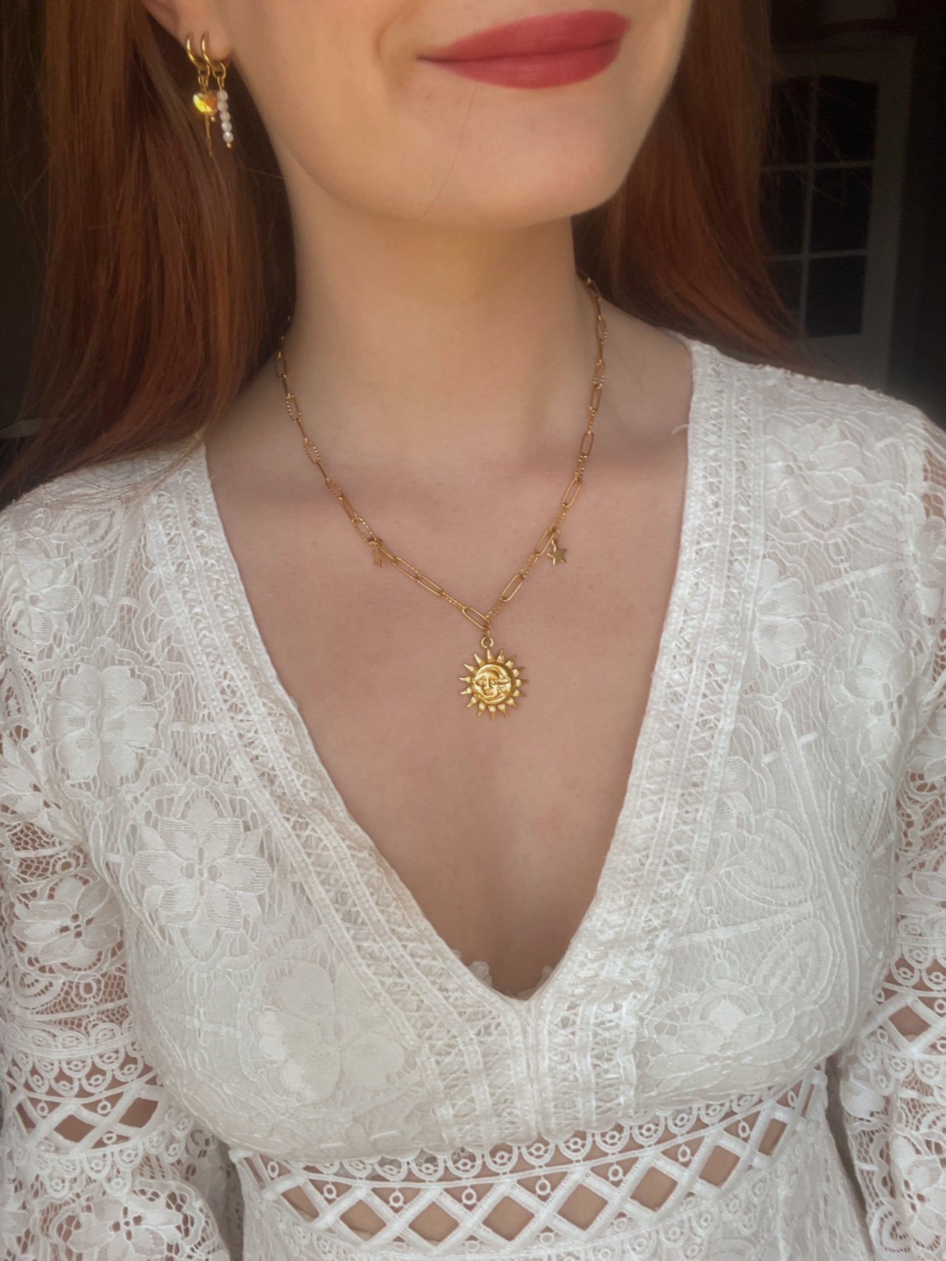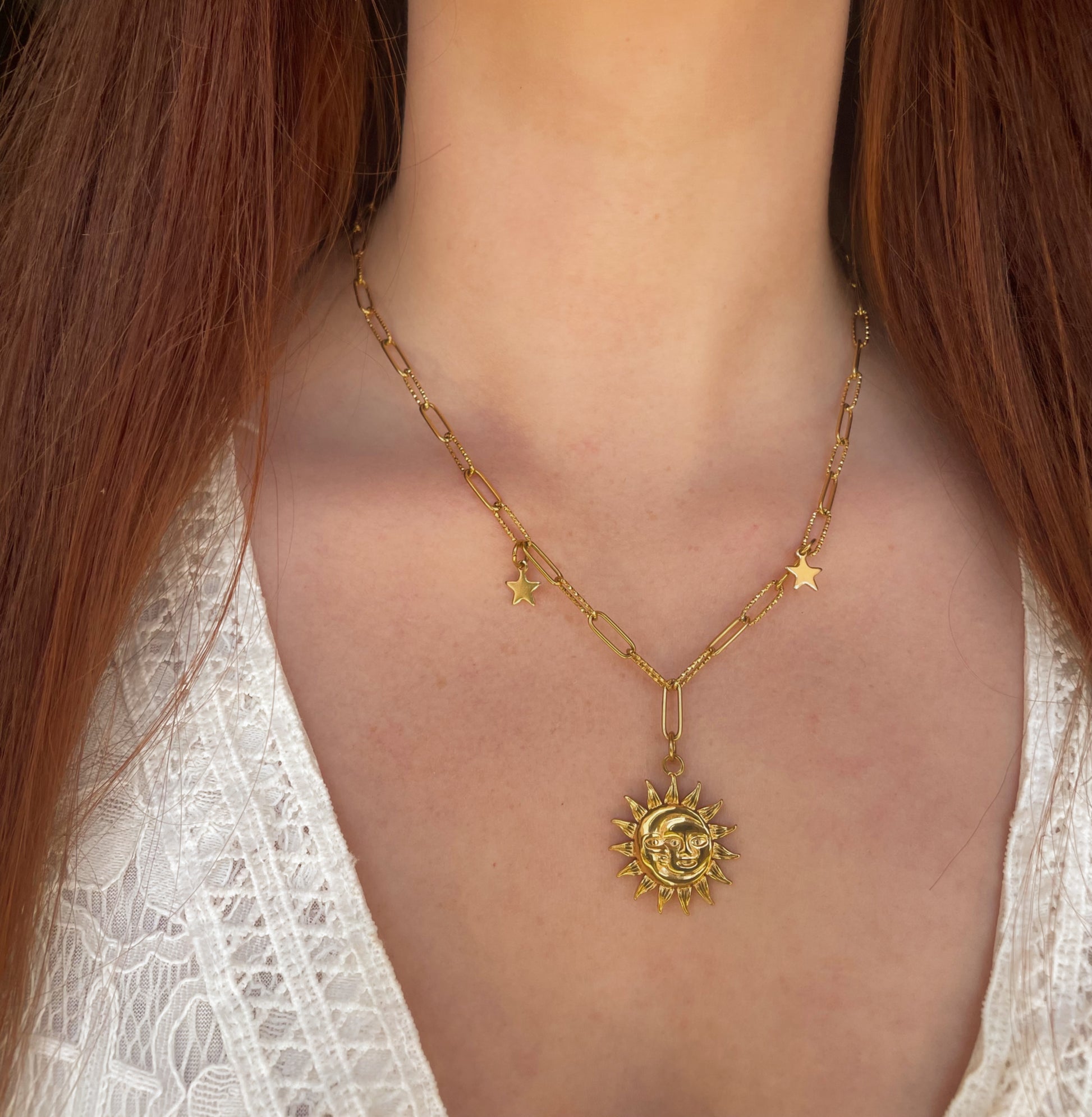 Description : Au centre, un pendentif représentant le soleil et la lune apporte une touche mystique et symbolique, accompagné de deux petits pendentifs en forme d'étoile🌙