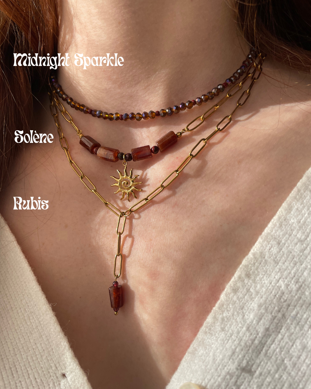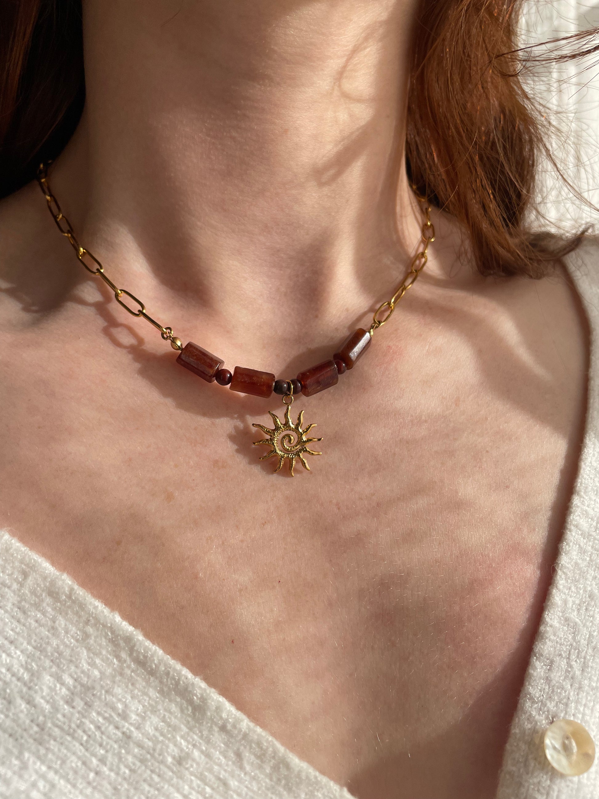 Description : Des pierres naturelles bordeaux — grenat hessonite et jaspe mookaite — associées à une chaîne couleur or. Au centre, un soleil doré, un collier puissant, vibrant, qui dégage une aura solaire et irrésistible 🔥✨