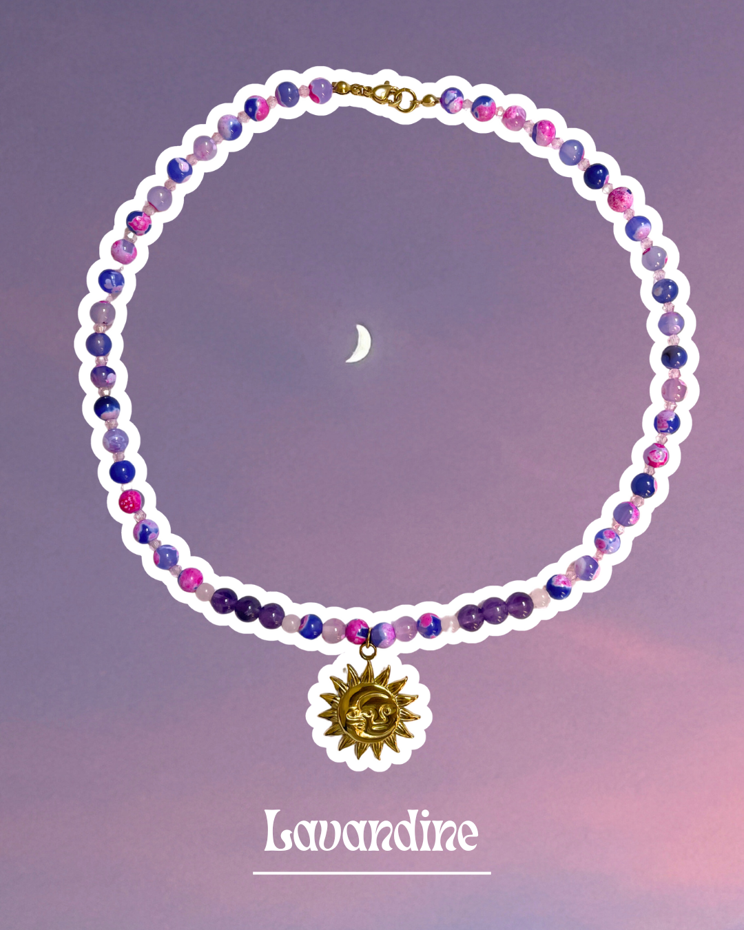 Description : Collier avec des perles aux reflets rose lilas et violet doux, qui captent la lumière comme des éclats de lavande au soleil couchant 💜🌞🌙