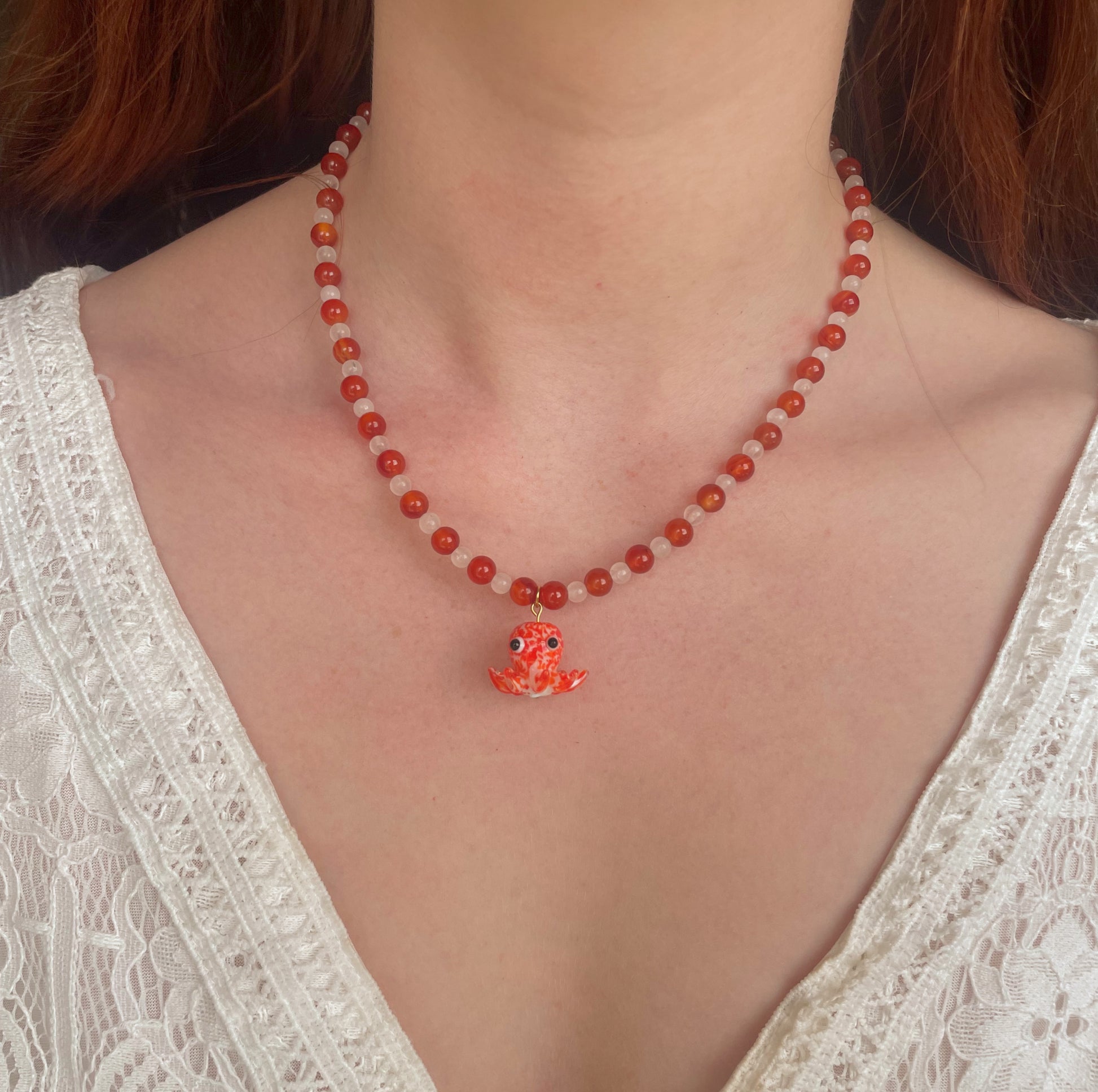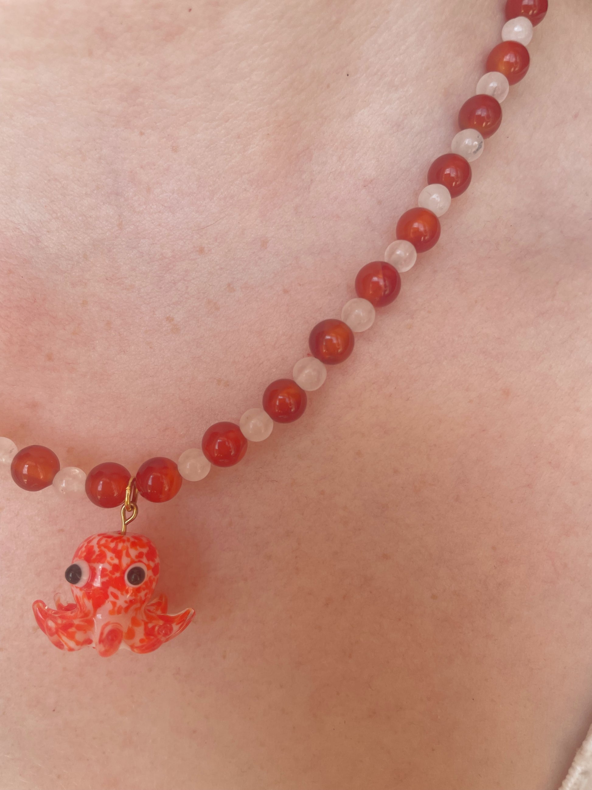 Description : Ce collier associe des perles rondes en cornaline à de plus petites perles en jade blanc. En son centre, un magnifique pendentif en verre représentant une pieuvre attire tous les regards. Une pièce forte, vibrante et pleine de caractère 🐙🔥