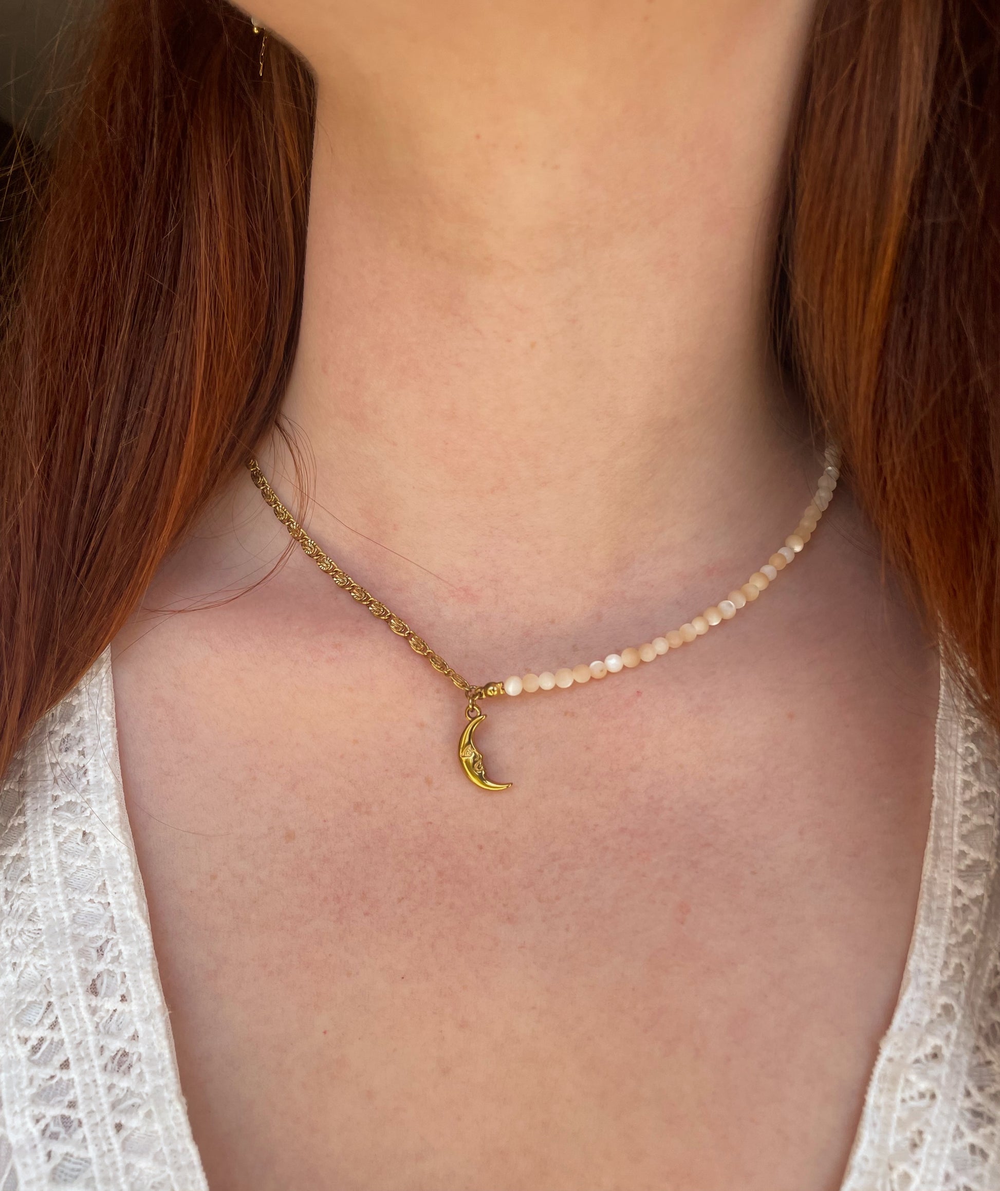 Description : Ce collier asymétrique associe harmonieusement des perles de nacre et une chaîne à motif. Au centre, un pendentif en forme de quart de lune apporte une touche poétique. Un bijou raffiné qui ne passe pas inaperçu 🌙✨