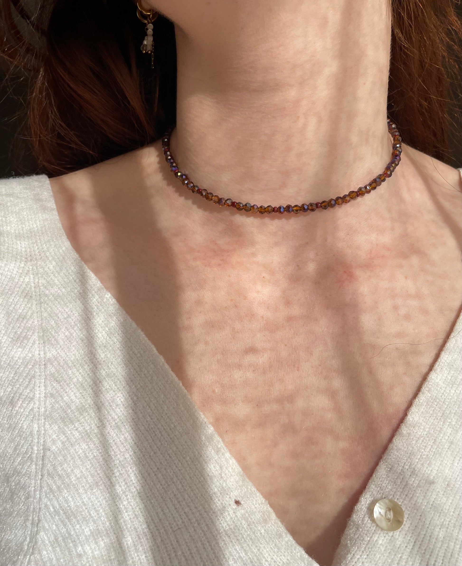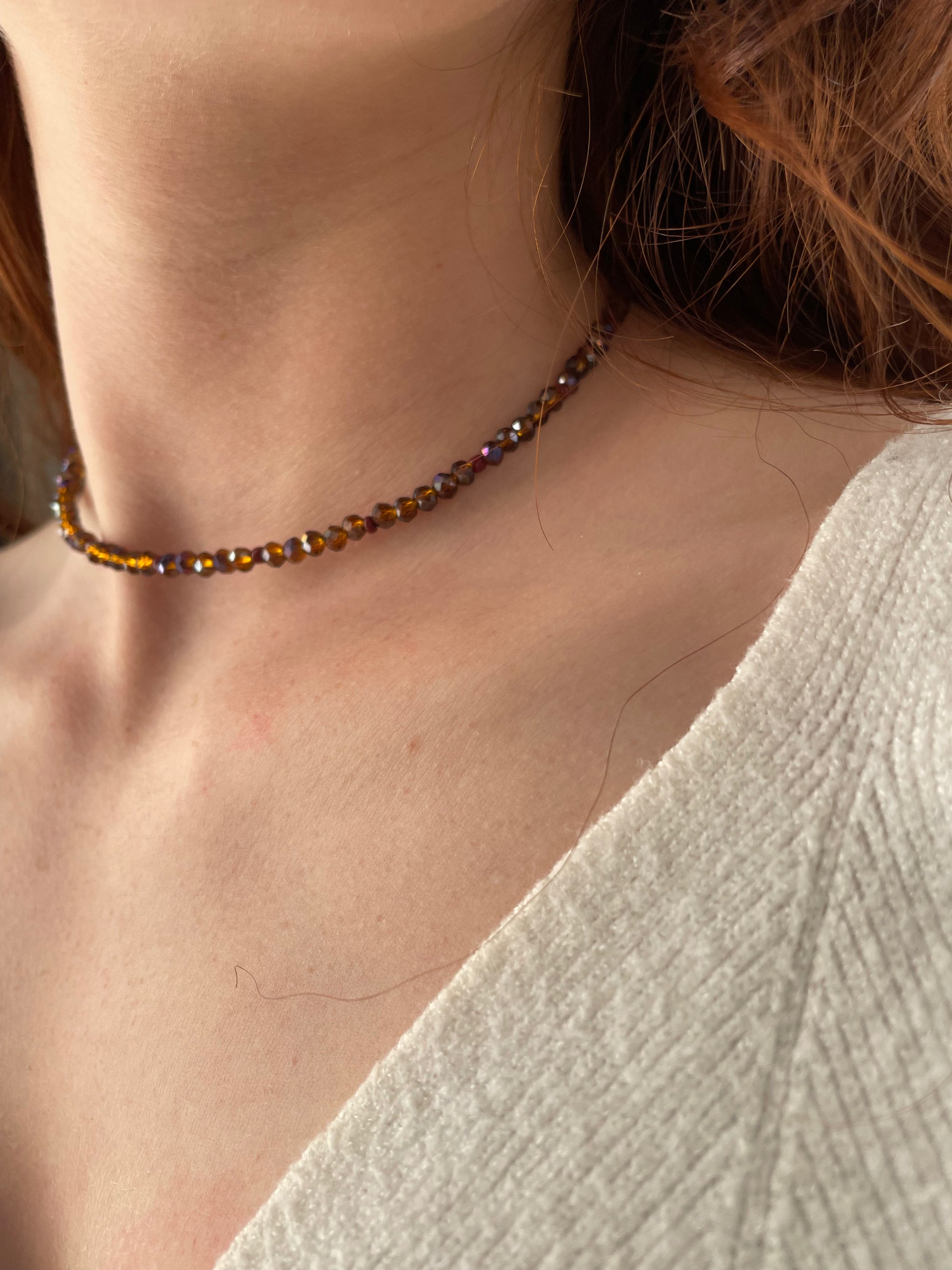Description : capture toutes les nuances de l’automne : des tons marron, bordeaux et pailleté qui vibrent au moindre mouvement. Ce ras-du-cou lumineux change subtilement de couleur selon la lumière, créant un effet hypnotisant ✨🍁