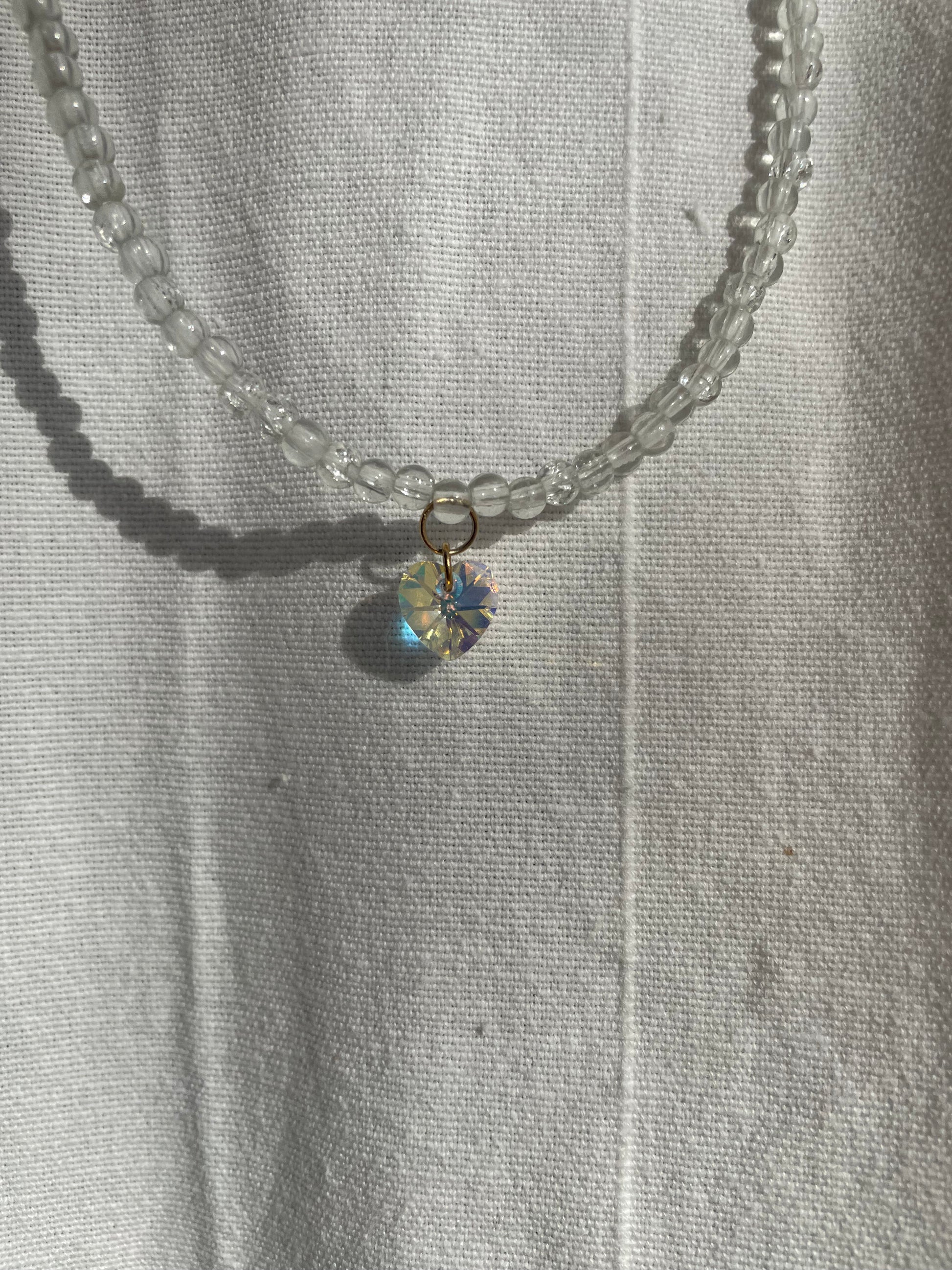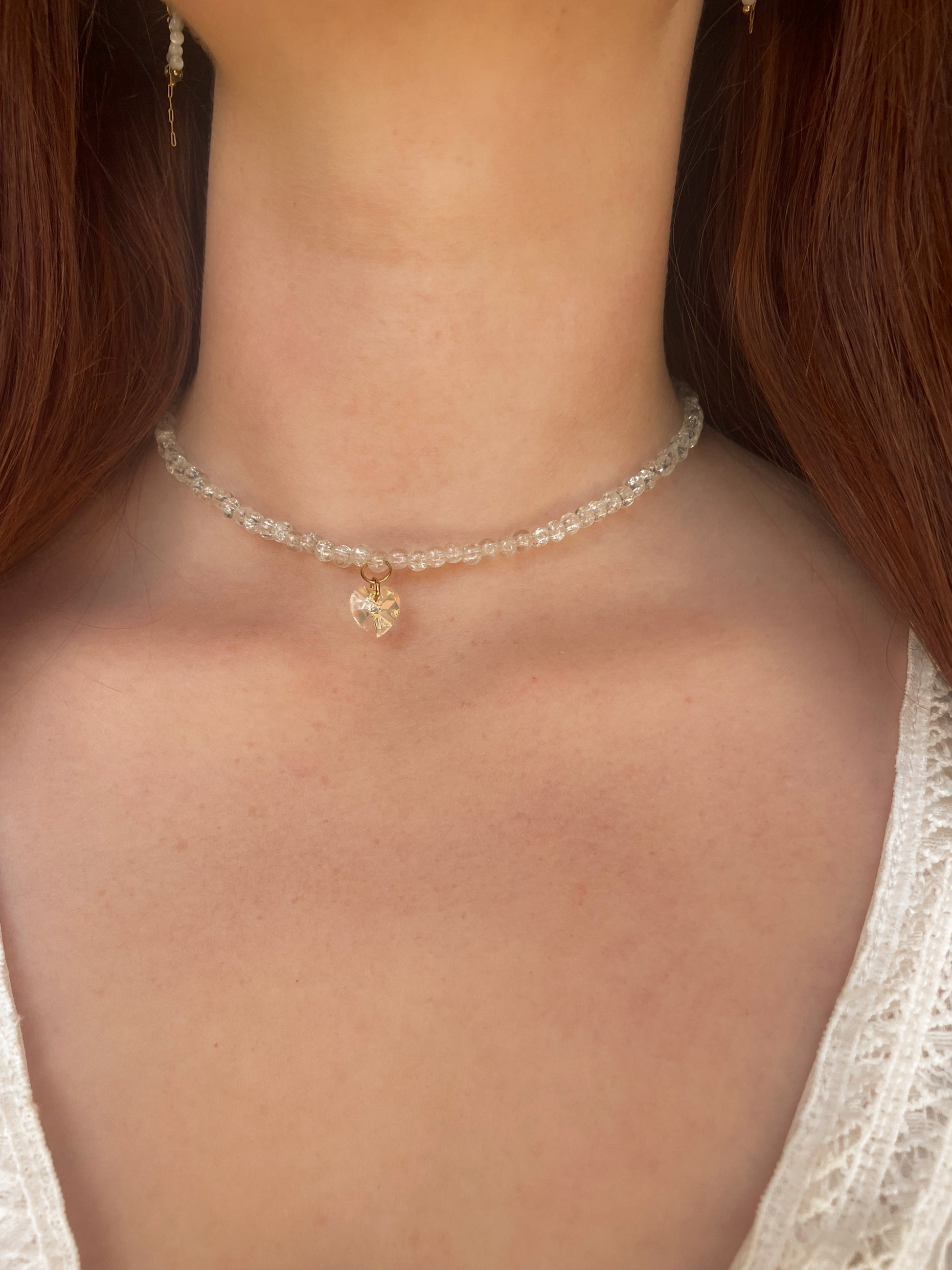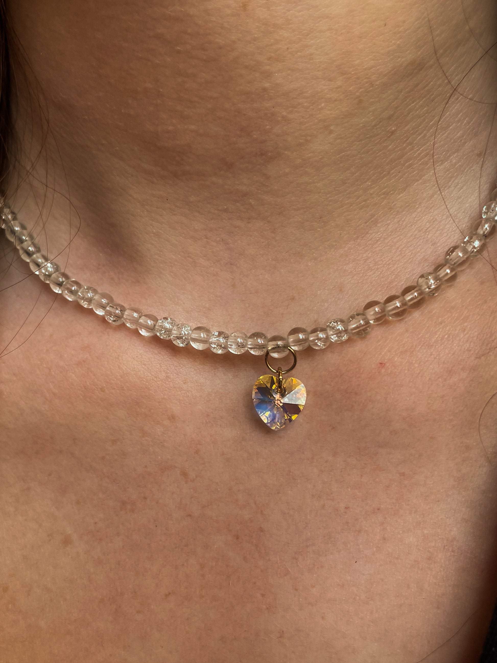 Description : Ce collier ras du cou est composé de perles transparentes, avec au centre un pendentif en forme de cœur qui capte et renvoie la lumière. Un bijou délicat, idéal pour sublimer votre style au quotidien 🤍✨